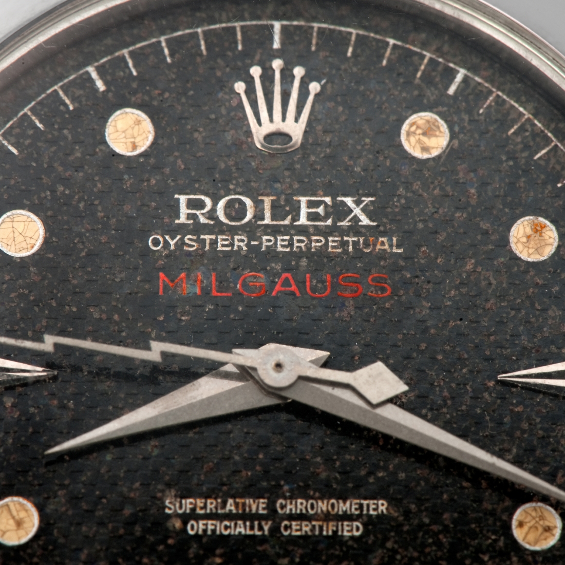ミルガウスファーストモデルです。こちらのモデルは回転ベゼルタイプとスムースベゼルタイプと2種類あります。ベゼル幅が広く、何といっても最大の特徴はレッドトップマーカーの「イナズマ型」の秒針です。ダイアルは四角模様のテクスチャー凹凸文字盤で、ブラックを背景に赤の”MILGAUSS”表記が印象的です。ムーヴメントは通常のCal.1065ではなく、磁気が入りにくい仕様に改良したミルガウス専用ムーヴ、”Cal.1065M”を搭載。磁気の侵入を防ぐ為、インナーケースを備えた二重構造です。また、ブレスレットは本体と年代が合致した1958年製の「ビッグロゴ」が付属しております。