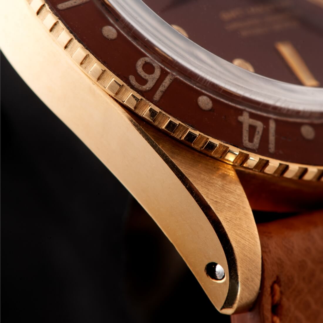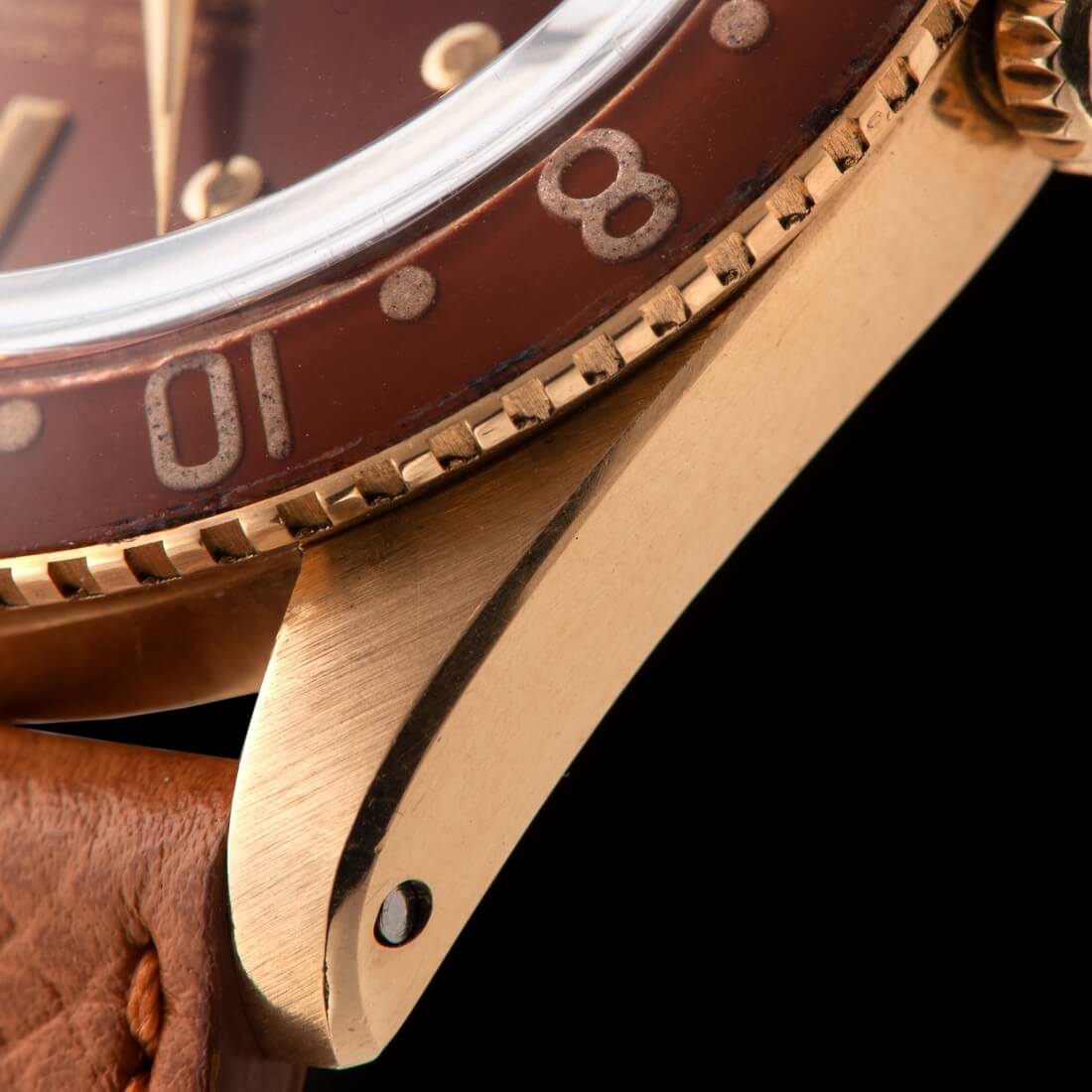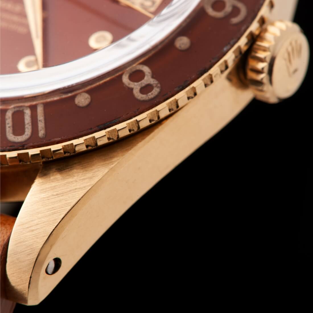 所謂GMT-MASTERファーストモデルの18金無垢バージョンです。今やステンレスモデルでさえマイナスポイントの無い個体を探すのは至難の業ですが、こちらは更に希少性の高い金無垢仕様のガードレスモデルです。ステンレスモデルは赤と青のベイクライトベゼルが採用されましたが、金無垢モデルはバーガンディーカラーのベイクライトベゼルとなり、ダイアルは同じくバーガンディーカラーのダイアルと、黄褐色の二種類となります。こちらは前者のタイプとなります。インデックスはニップル(乳首)アワーマーカーが初めて採用され、金無垢のGMTマスターの証とも言える地位を築きました。針はステンレスモデルはメルセデス針となりますが、こちらの金無垢モデルはアルファ型が採用されました。ケース、ダイアルコンディションもさることながら、ヒビが入りやすいベイクライトベゼルに一切ヒビが入っていない点も奇跡と言って過言ではありません。