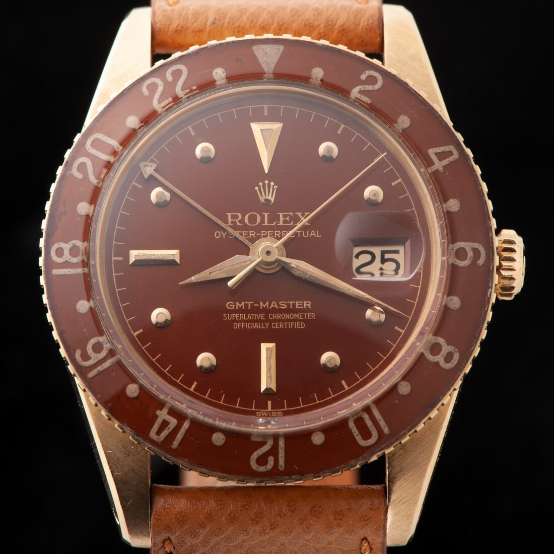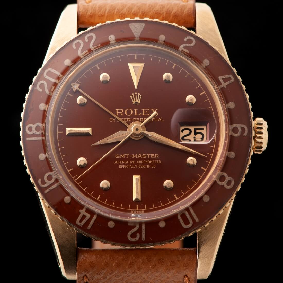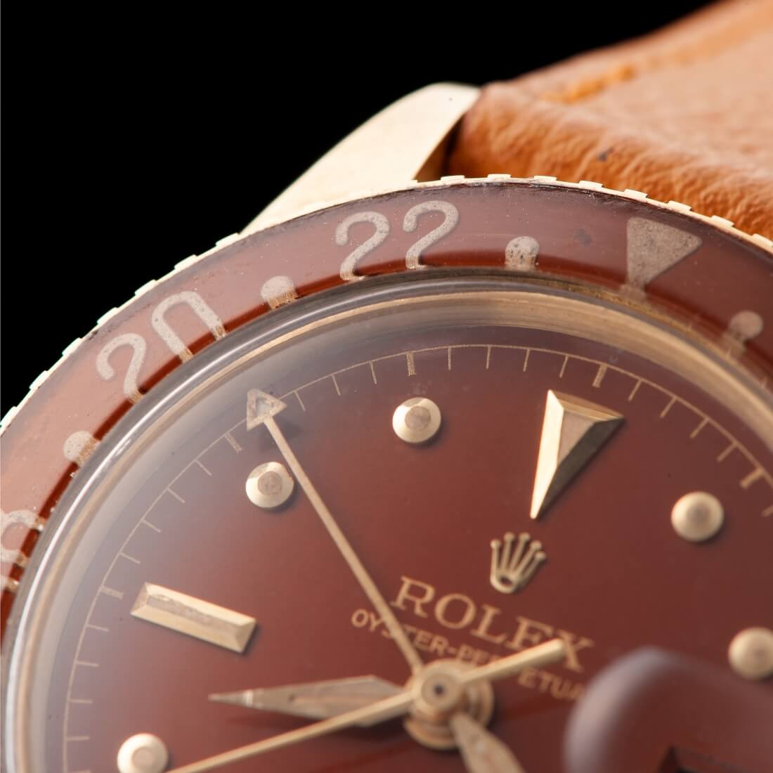 所謂GMT-MASTERファーストモデルの18金無垢バージョンです。今やステンレスモデルでさえマイナスポイントの無い個体を探すのは至難の業ですが、こちらは更に希少性の高い金無垢仕様のガードレスモデルです。ステンレスモデルは赤と青のベイクライトベゼルが採用されましたが、金無垢モデルはバーガンディーカラーのベイクライトベゼルとなり、ダイアルは同じくバーガンディーカラーのダイアルと、黄褐色の二種類となります。こちらは前者のタイプとなります。インデックスはニップル(乳首)アワーマーカーが初めて採用され、金無垢のGMTマスターの証とも言える地位を築きました。針はステンレスモデルはメルセデス針となりますが、こちらの金無垢モデルはアルファ型が採用されました。ケース、ダイアルコンディションもさることながら、ヒビが入りやすいベイクライトベゼルに一切ヒビが入っていない点も奇跡と言って過言ではありません。