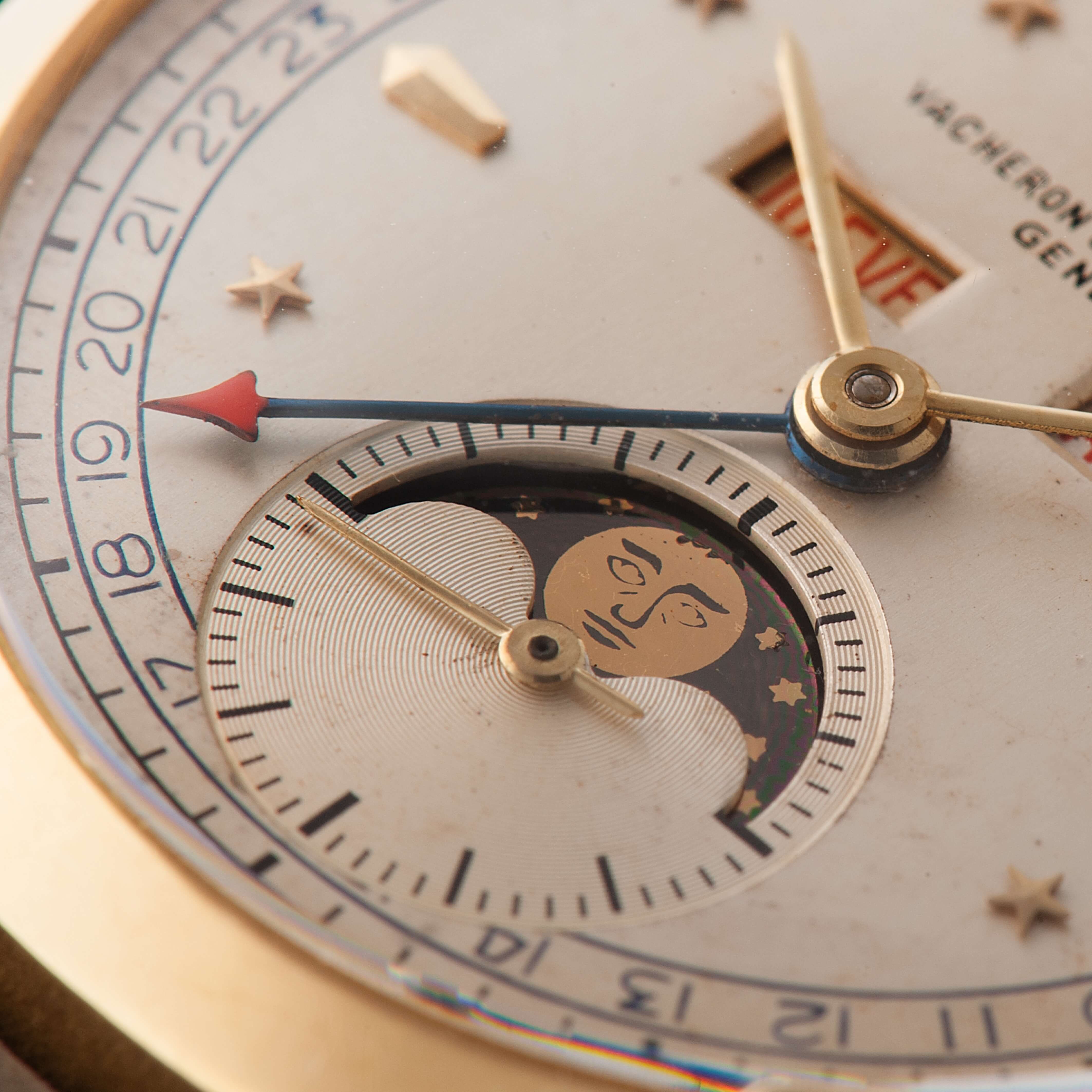 星の形のインデックスはこのモデルに限らず通称「スターダイアル」と呼ばれ、各メーカーでごく稀に散見されます。18金イエローゴールドのケースは個性的なラグデザインで、さらにオリジナルのリューズの形も、通常の物とは一線を画する煌びやかなデザインです。スターダイアルとムーンフェイスの競演が秀逸です。