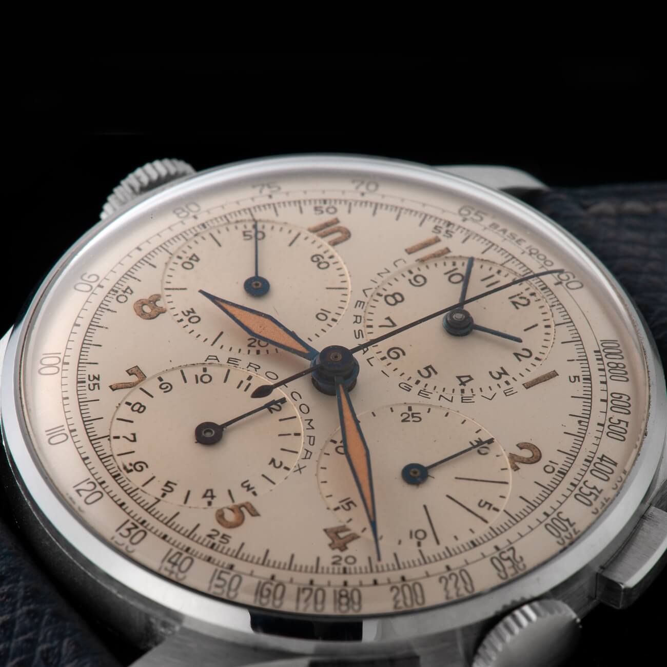 クロノグラフが得意のユニバーサル社において、様々なペットネームがありますが、“AERO COMPAXCOMPAX”名もその中の代表的なモデルの一つです。ダイアルに並ぶ4つのカウンターが、他に類をみないスタイルのクロノグラフで、スモセコ、30分と12時間の積算計に加え、12時位置にはメメントダイアルと呼ばれる「時間を記録するためだけ」時計機能とは連動しないカウンターが付きます。ケースに磨きが一切入っていない未使用に近いコンディションとなります。