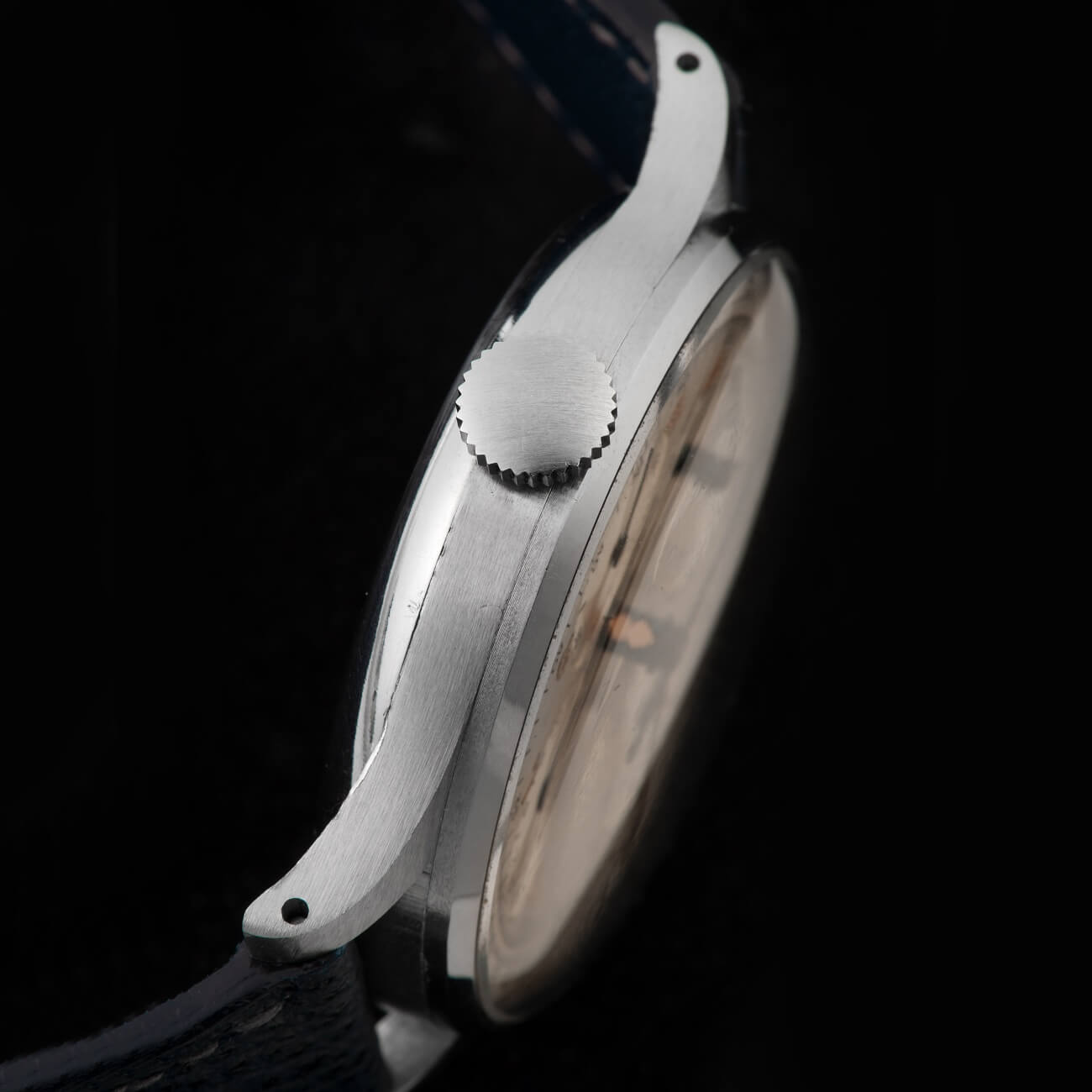 ケース径は37mmで当時の時計としてはかなりの大きさがあることからもこの時計がいかに特別な用途で作られたかが想像できます。MARK IXはストレートラグも存在しますが、本商品はミドルケースからラグにかけて綺麗な曲線を描くカラトラバシェイプのタイプです。