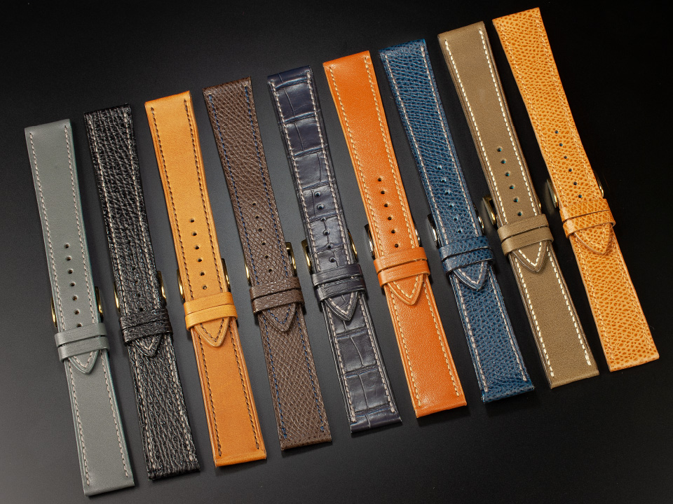 上質な皮革へのこだわりが強く、基本となる素材選びから専属チームが多くの時間を要し選定しています。クロコダイルをはじめ、各種エキゾチックレザーからカーフまで豊富なバリエーションを展開。素材の選定からはじまり、希望の型、裏材、ステッチなど細かくヒアリング。顧客のニーズに対応した「こだわり」の想いを1本のストラップに詰め込んでいます。